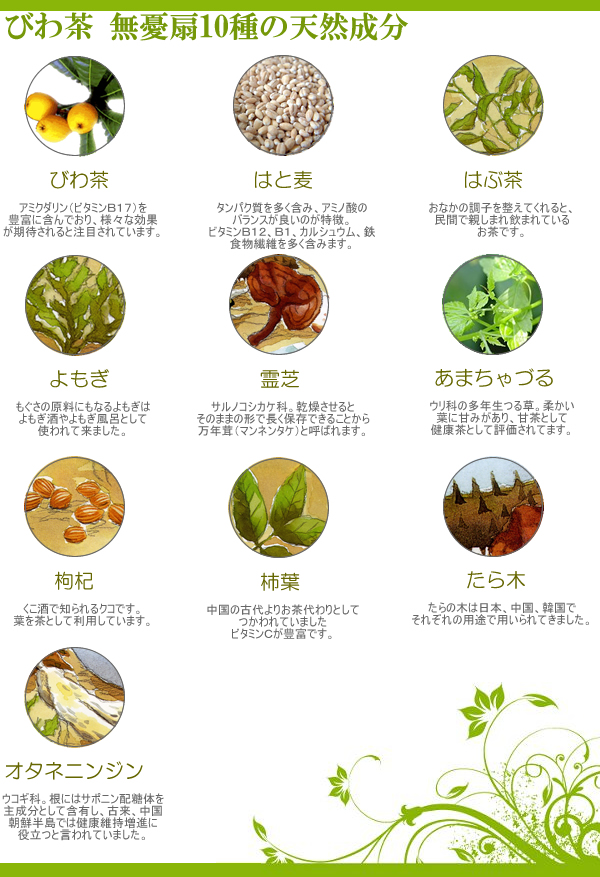 自然界の陰陽論に基づいて10種類の原材料を配合し、 生体内のバランスを整え、健康維持を図るため誕生したのが びわ茶「無憂扇(むゆうせん)」です。 お茶としてご愛飲頂く他、はちみつやレモン、 焼酎などとブレンドしても美味しくいただけます。 まろやかな上品な味と上品な香りに仕上げた無憂扇を ご家庭でお楽しみください。
