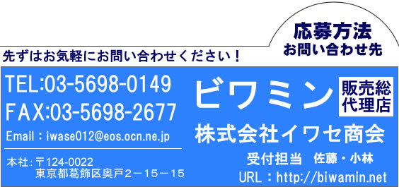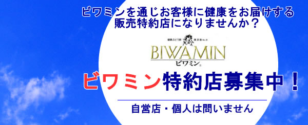 健康ぶどう酢ビワミン販売総代理店 (株)イワセ商会がビワミン・ビワミンゴールドの 販売特約店を募集いたします。 酒販店・米穀店・喫茶店・美容院・整骨院等での お取扱いが拡大中です! 自営店の売上増大に最適な人気商品です。